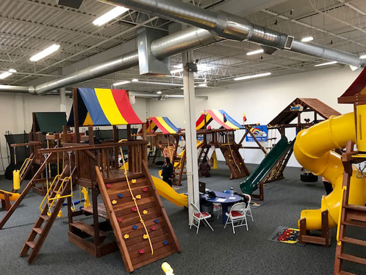 In 2000 we opened a huge indoor showroom in our 20,000 square foot building in Vernon Hills that also holds our main warehouse. Our primary focus is on swing sets, so you can rely on our expert sales staff to help you find the right play system for you and your family. The showroom features many fully assembled sets so you can bring your kids along to test them out!